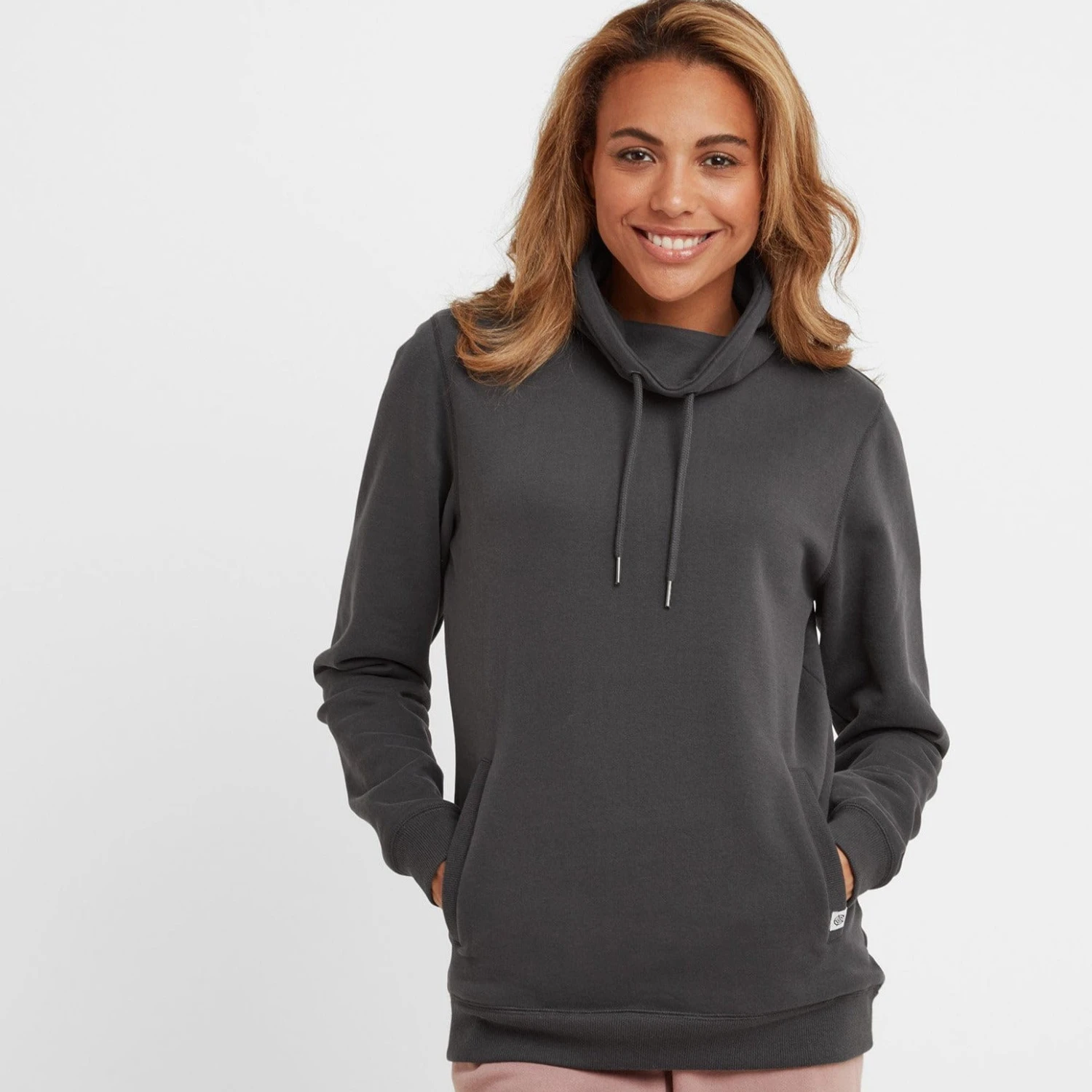 Super soft, cosy and enticing, our Abigail funnel neck sweatshirt feels as good on as it looks and is perfect for a brisk walk across the Yorkshire moors, meeting friends or snuggling up on the sofa. The inside is brushed so it feels extra soft against the skin and it has a soft, peach finish outside. The funnel neck drapes softly to feel cosy and is finished with chunky knitted drawcords, so you can adjust the fit to wear it your way. There is generous ribbing at the pocket edges, cuffs and hem, for cosiness and to help keep its shape for years to come. Designed in muted colours inspired by the Atlantic ocean, Abigail is finished with our signature small woven Yorkshire Rose label on the edge of the pocket.