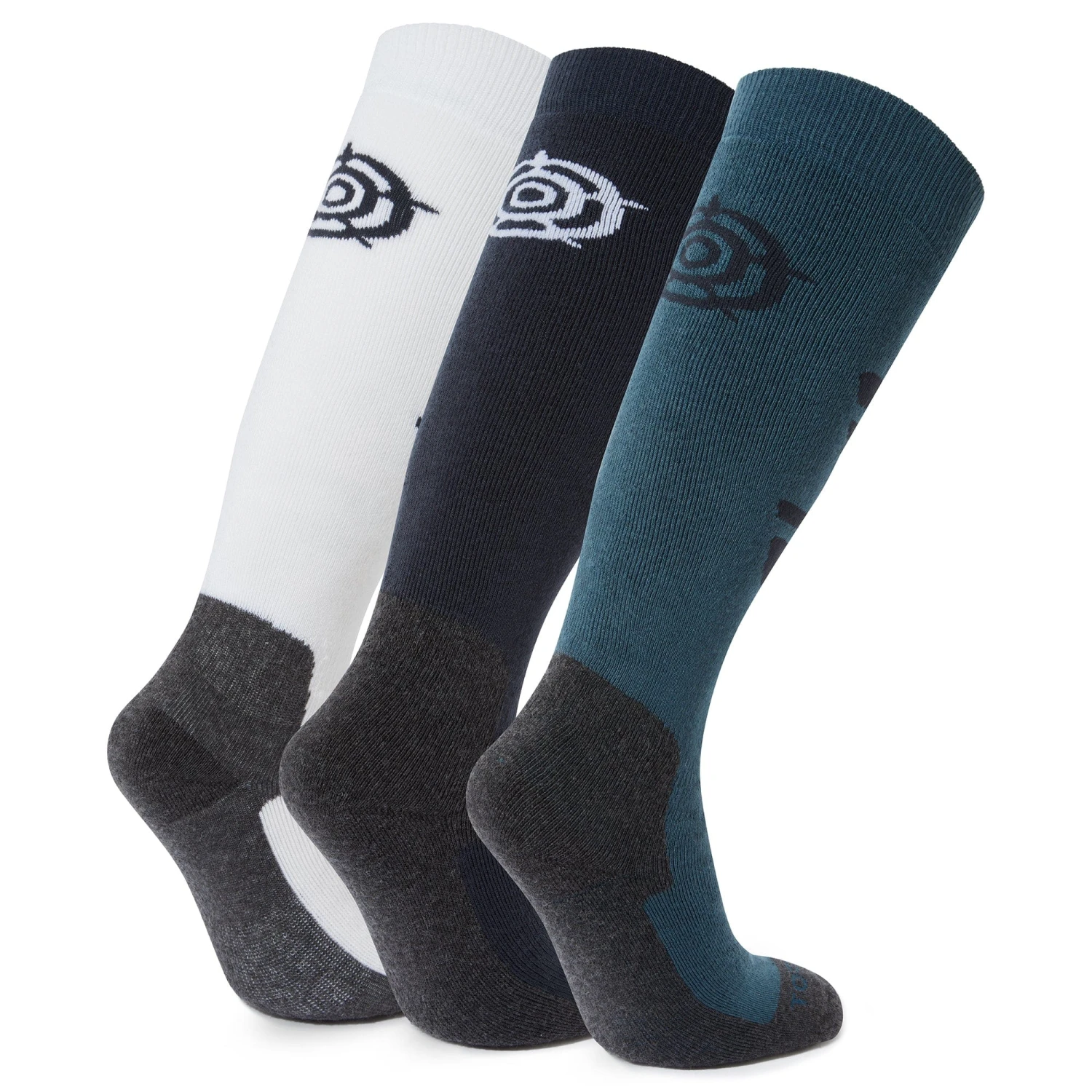 Our Bergenz Ski Socks are designed to be the perfect ski sock for anybody, no matter their level of ski expertise. Made from an ultra comfy merino blend, these socks have comfort at their core. Key sections of the sock are cushioned to prevent blistering and discomfort on the skin, keeping the cushioning focussed on key, high-contact, parts of the foot and shin stops these socks being too heavy and cumbersome, ensuring great flexibility on the slopes. Re-inforced heel and toe areas offer additional protection and non-slip cuff grips keep your socks where you need them to be. These 3 Packs give you 3 pairs of socks in a range of colours, so you can look as good as you feel.