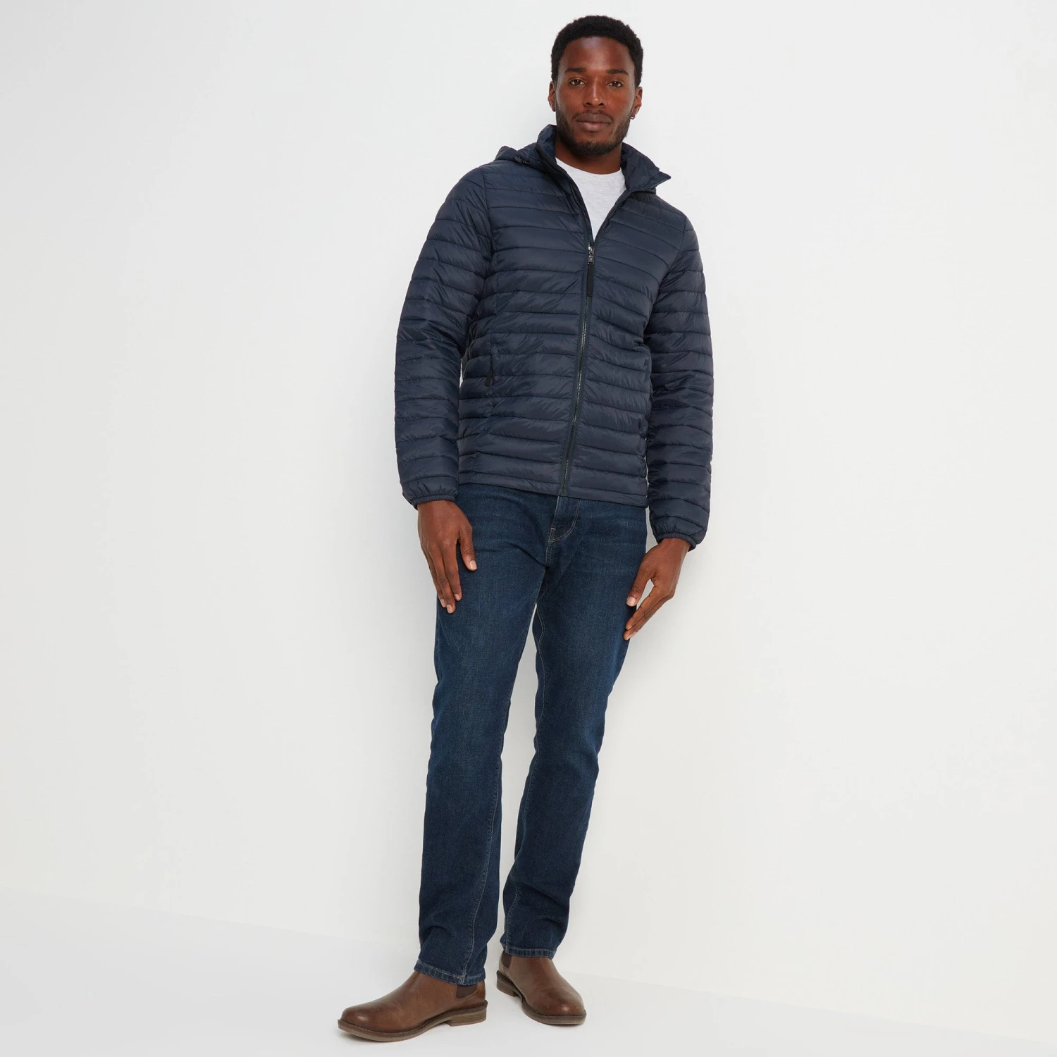 Studio model Efosa is wearing size M and is 6’1″, chest 40″, waist 31″