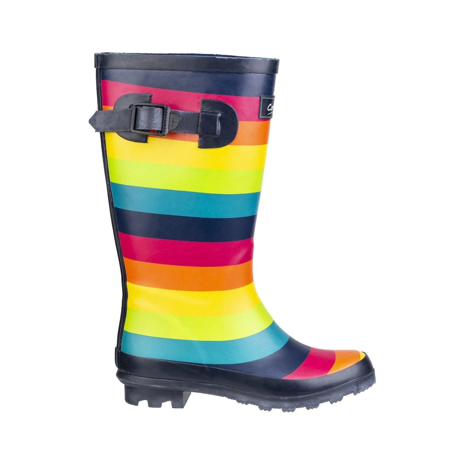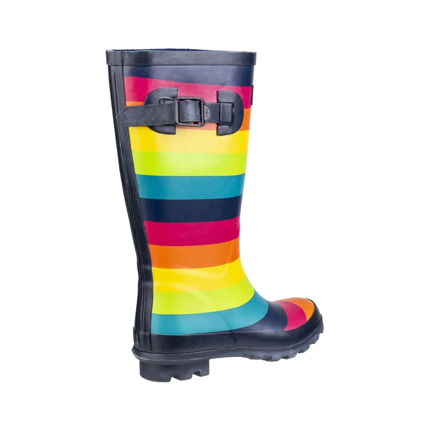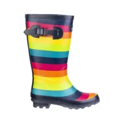 From the heart of the countryside comes this classy junior wellington with stylish rainbow print and midnight blue finishes designed for older children. The premium rubber materials offer excellent waterproofing and grip on muddy terrain.
