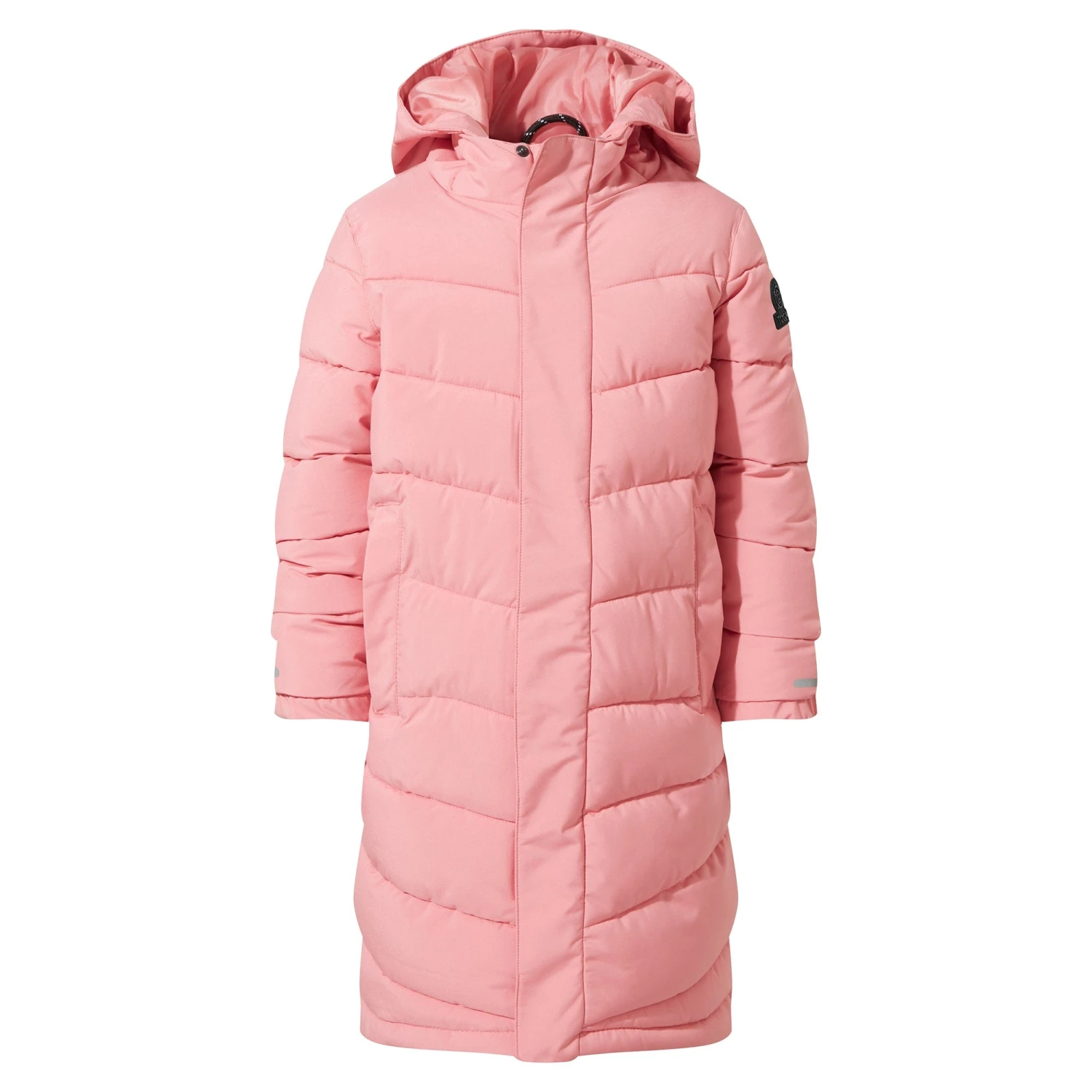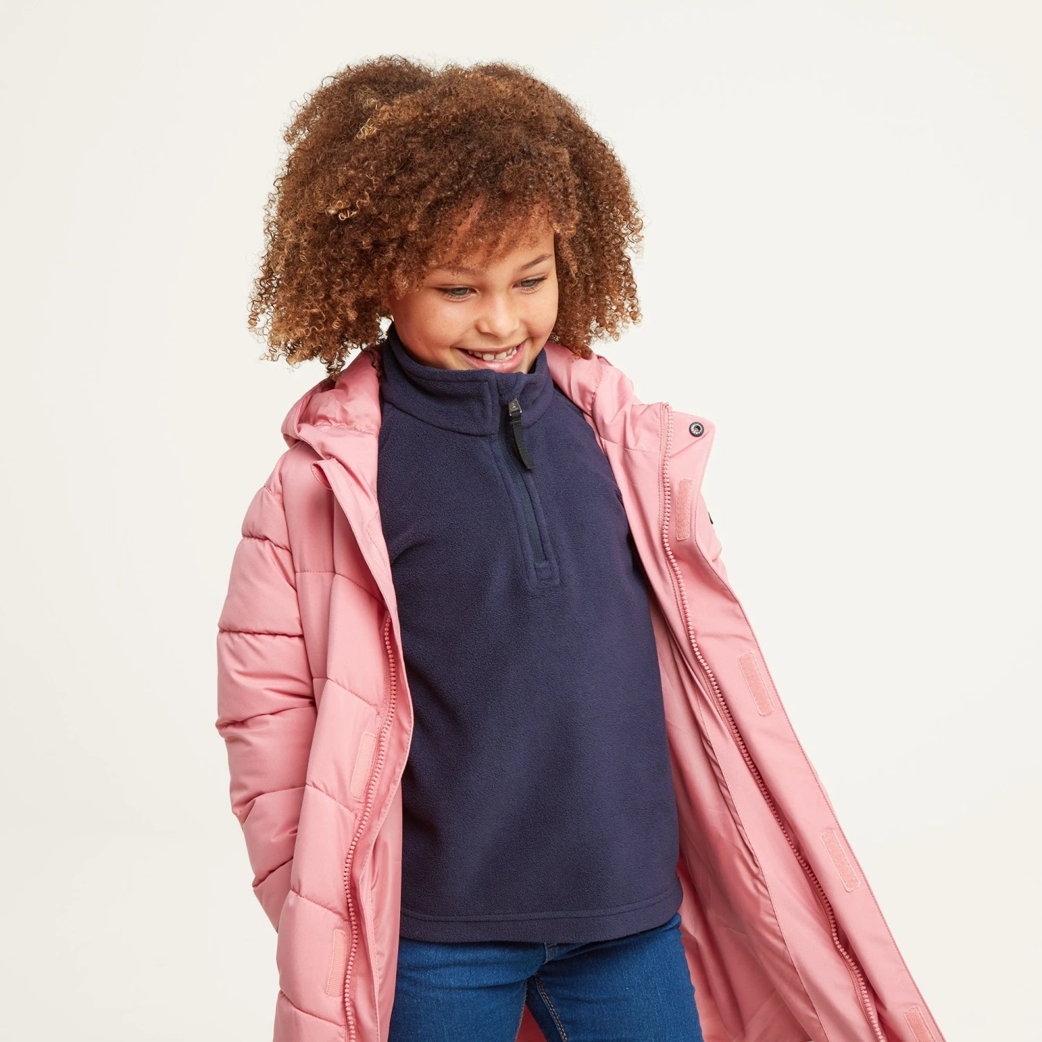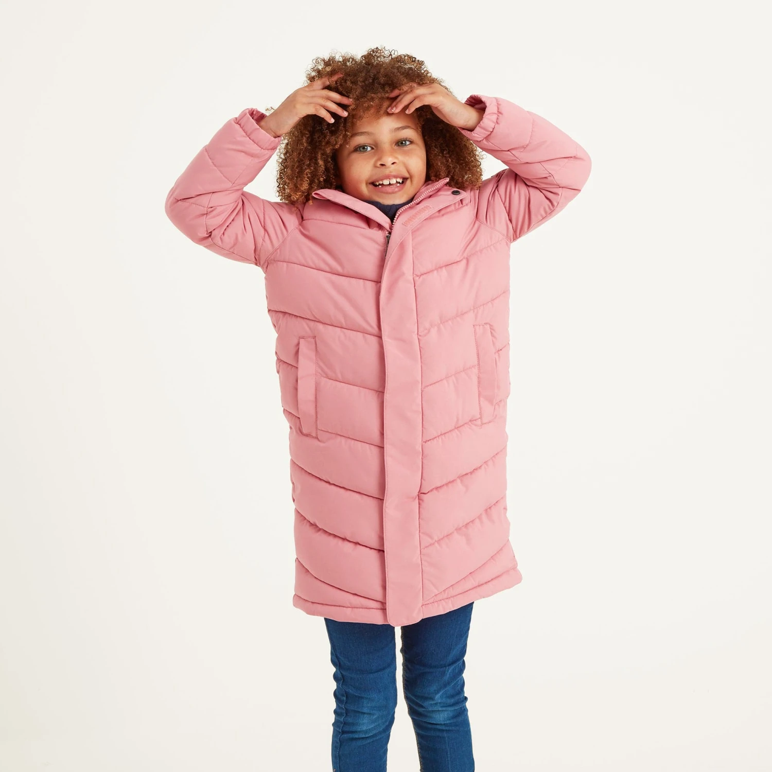 Designed by our team in West Yorkshire to stand up to the toughest winter days by keeping the wind out and the heat in, our Dollis kids coat feels so warm and cosy on it’s like wearing a duvet. This extra long coat is quilted in a chunky chevron design and is thickly padded with a warm, insulated eco filling made from recycled plastic bottles. There is a cosy fixed hood with a Velcro adjuster tab at the back for a custom fit and two lower pockets that are perfect for slipping cold hands into. Dollis is easy to get on and off thanks to a chunky two-way zip secured with press studs and Velcro, so it makes a great coat for school as well as action-packed weekends. There are neat reflective safety prints above the back hem and cuffs that stand out against car headlights for increased visibility at night and the finishing touch is an embossed rubber TOG24 Rose badge on the sleeve.