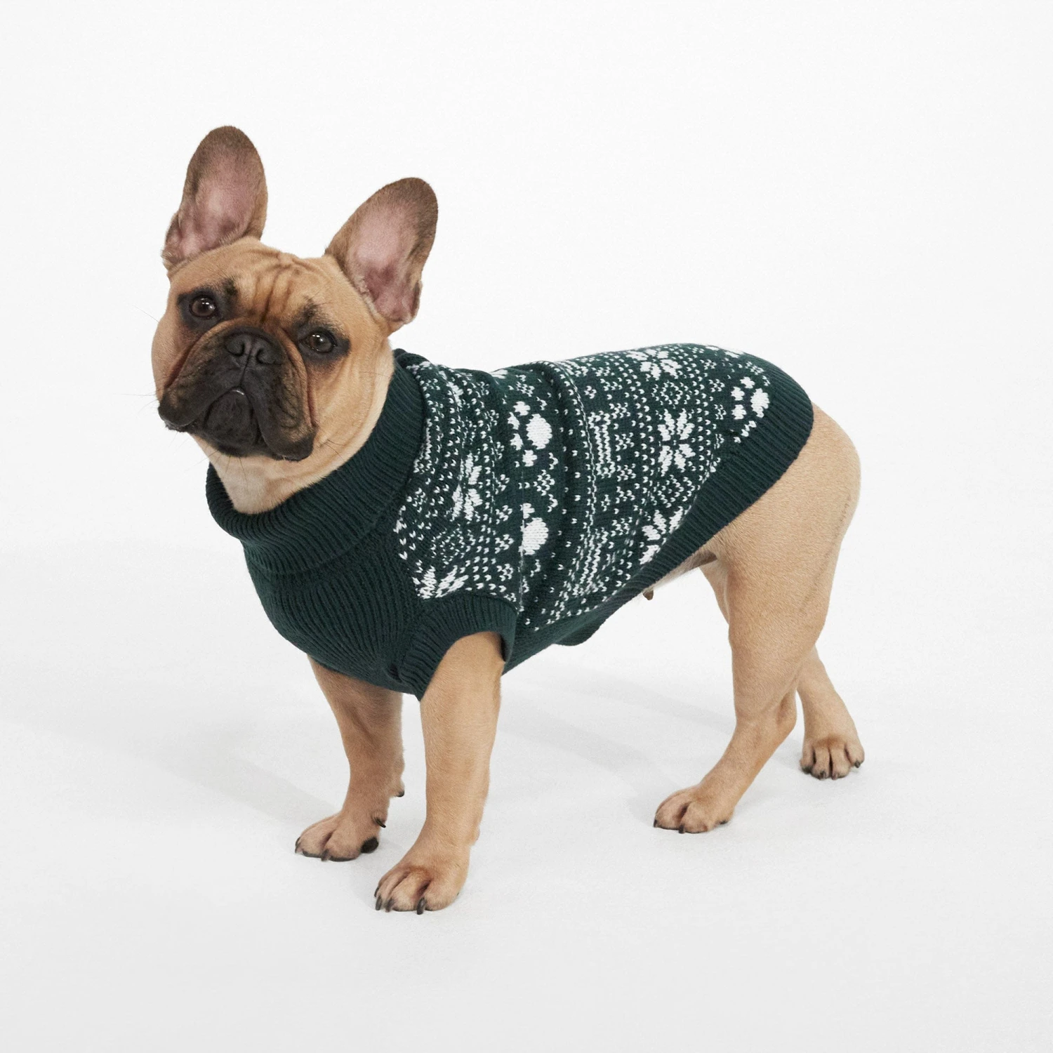 Keep your dog cosy and warm while looking fantastic in our Doodle dog jumper. Coming with a Fairisle-inspired pattern, this wintery dog coat is a great way to keep your dog protected from the elements while looking super smart. With an adorable roll neck hem and a super soft knitted finish, this brilliant little coat is a delight for dogs to wear. Keeping practicality front of mind, there’s also a handy hole for their lead attachment at the back and leg holes to ensure the jumper stays in place while they’re running and playing. An overall stylish number for your little pooch.