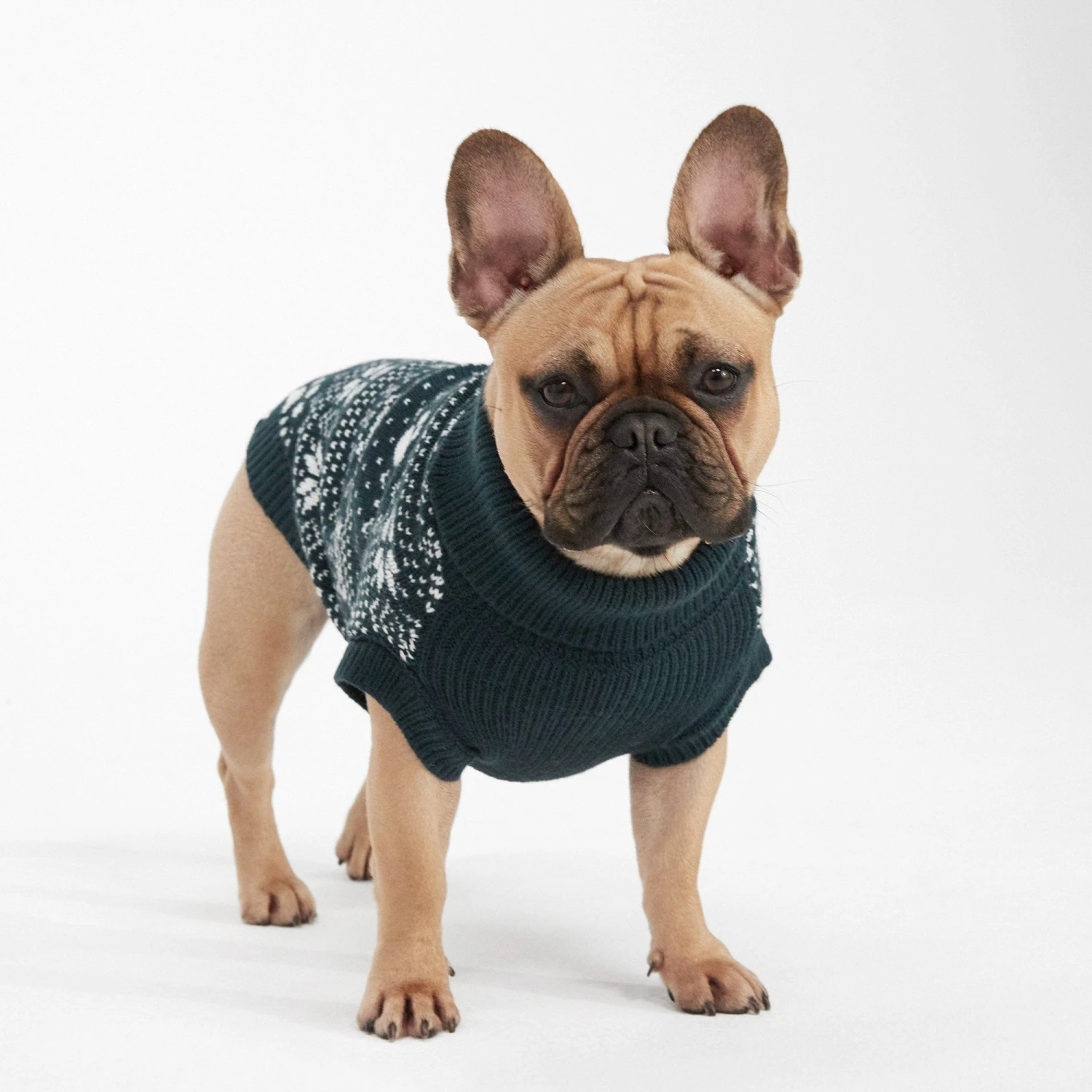 Keep your dog cosy and warm while looking fantastic in our Doodle dog jumper. Coming with a Fairisle-inspired pattern, this wintery dog coat is a great way to keep your dog protected from the elements while looking super smart. With an adorable roll neck hem and a super soft knitted finish, this brilliant little coat is a delight for dogs to wear. Keeping practicality front of mind, there’s also a handy hole for their lead attachment at the back and leg holes to ensure the jumper stays in place while they’re running and playing. An overall stylish number for your little pooch.