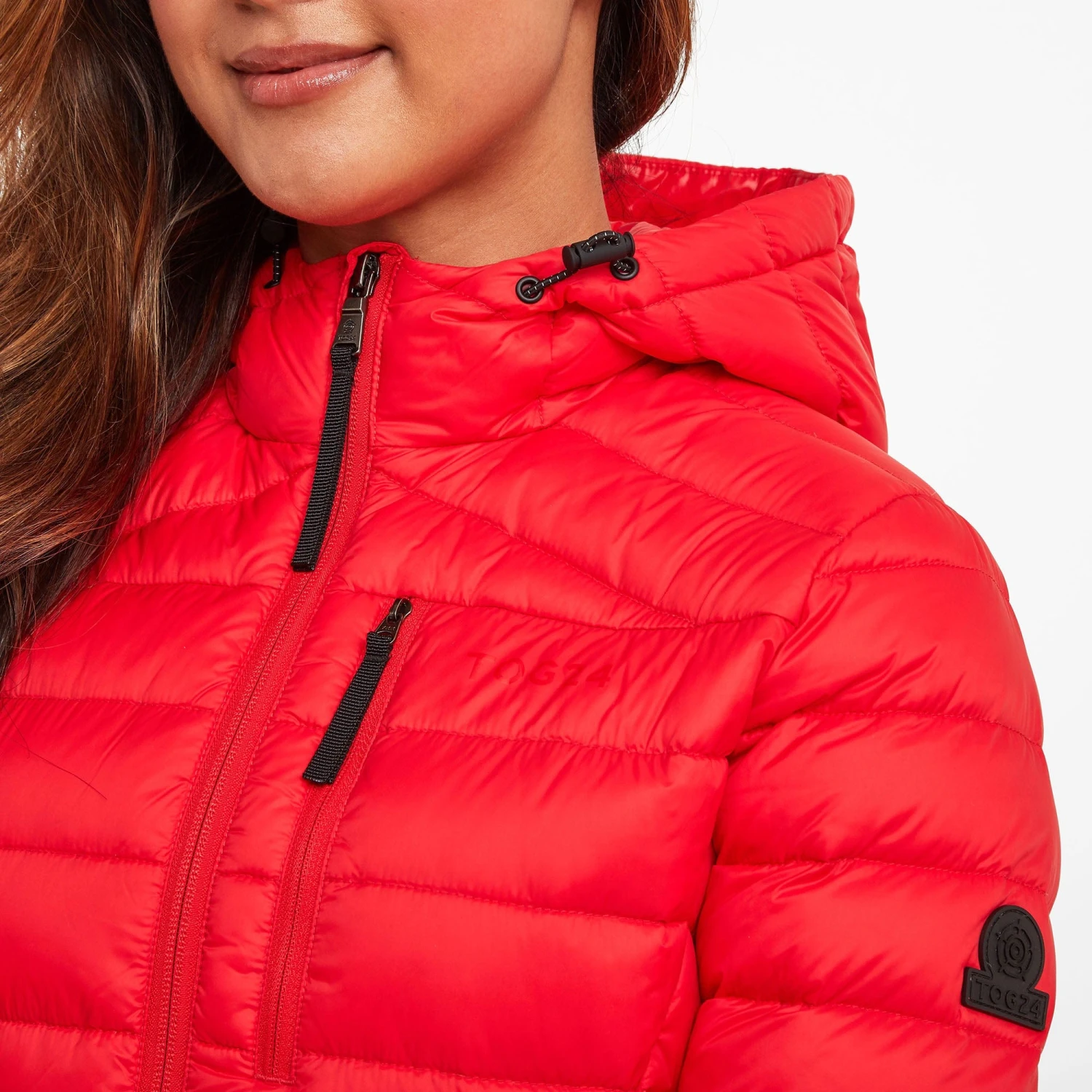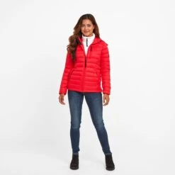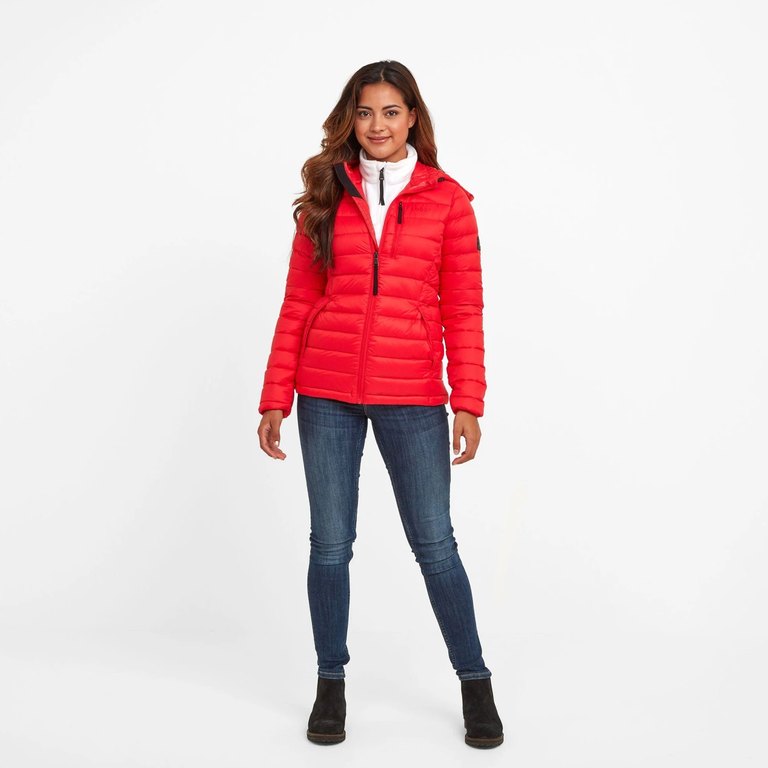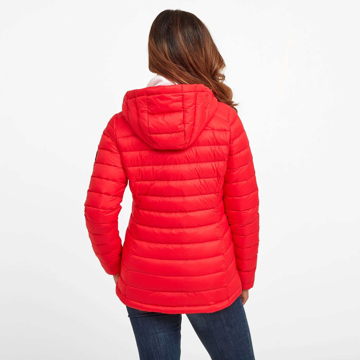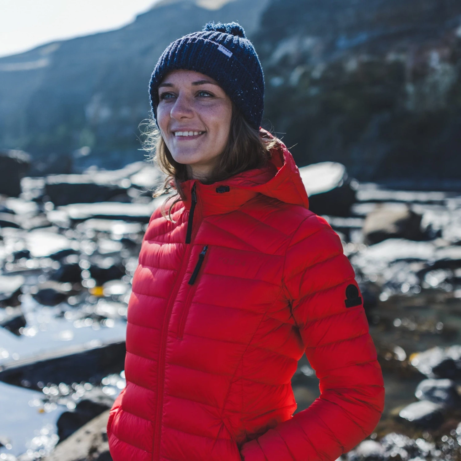 Perfect for adding a layer of warmth without any bulk, our Drax down filled womens jacket with adjustable hood is soft and silky to the touch, incredibly light and packs down small into a zip up inside pocket. You’ll have no trouble finding room for it in your case when you go away, and it also makes a handy travel pillow. This padded jacket gets its incredible warmth from naturally insulating duck down that traps heat without being bulky. Sleek panelling and a grown on hood that hugs your neck creates a flattering fitted silhouette and it feels as good as it looks with details like a soft chin cover over the top of the zip. Designed to squish down really small, then spring back into shape, Drax has roomy side pockets protected by an elasticated flap, light elastic at the cuffs and small toggle adjusters at the hem keep the chill out. Designed in Yorkshire, where we always need layers, our Drax womens hooded jacket is ideal for wearing over a top when it’s only a bit chilly or layering