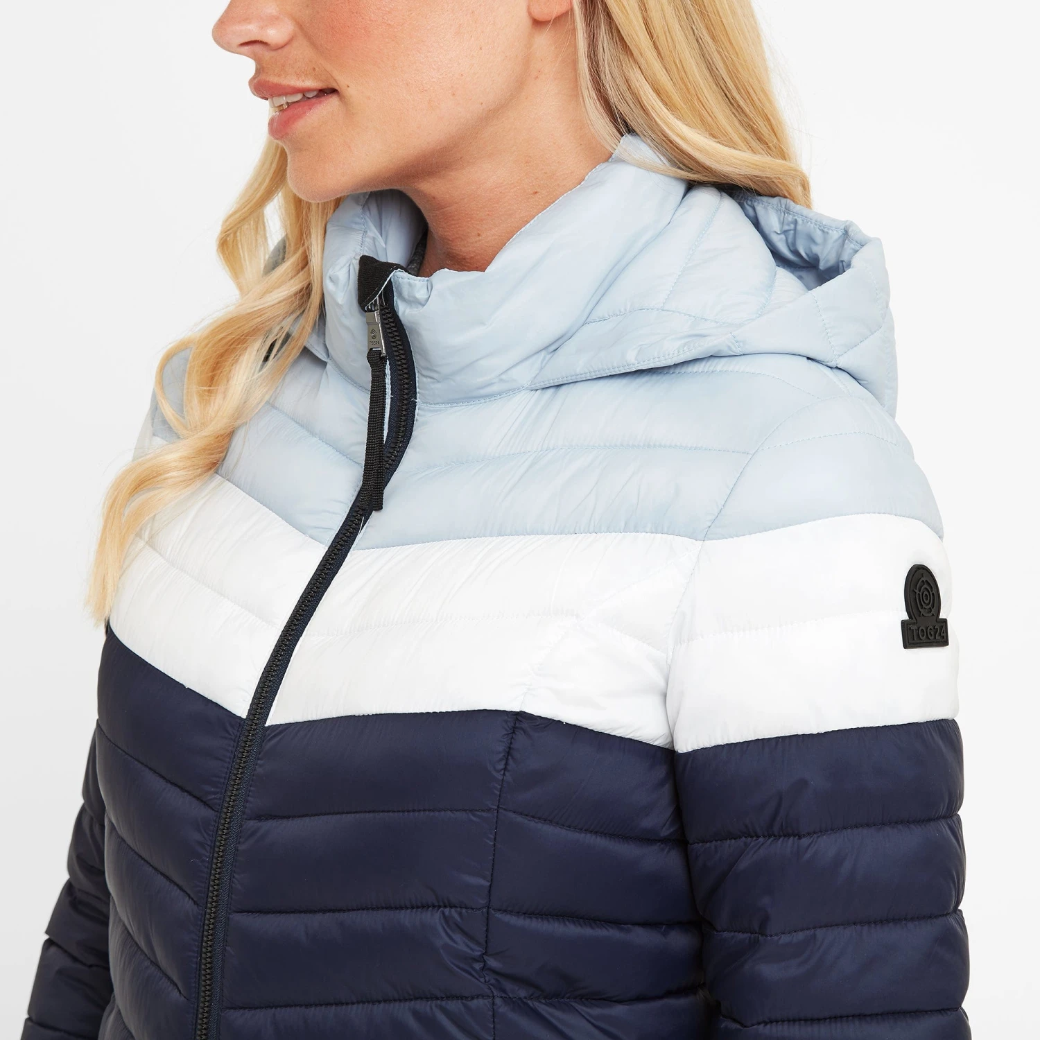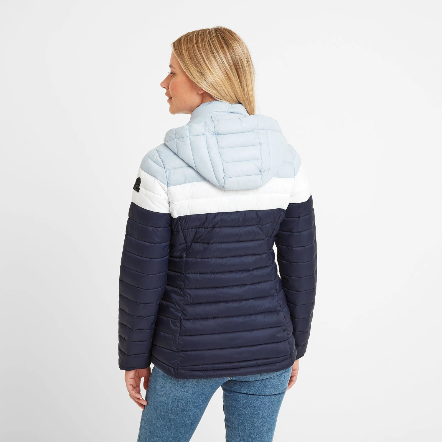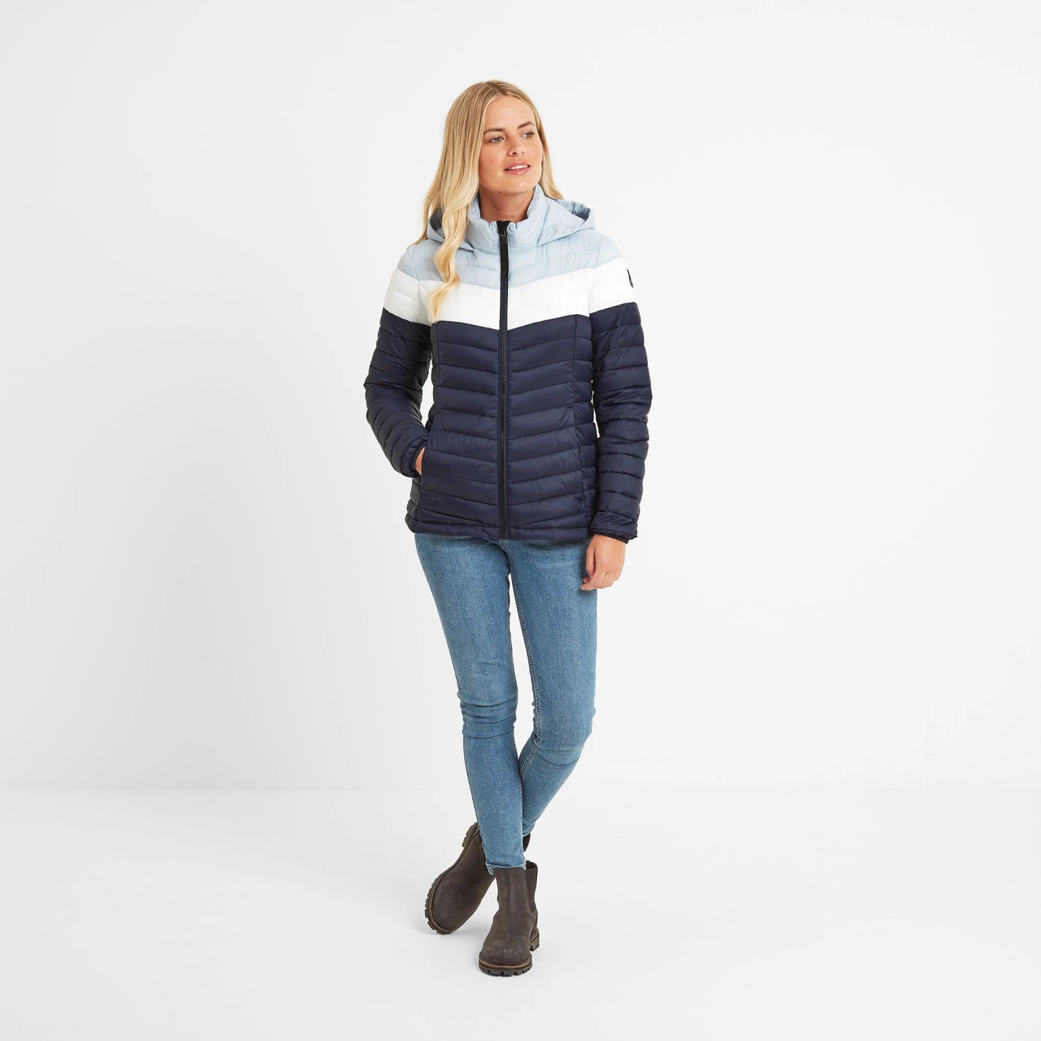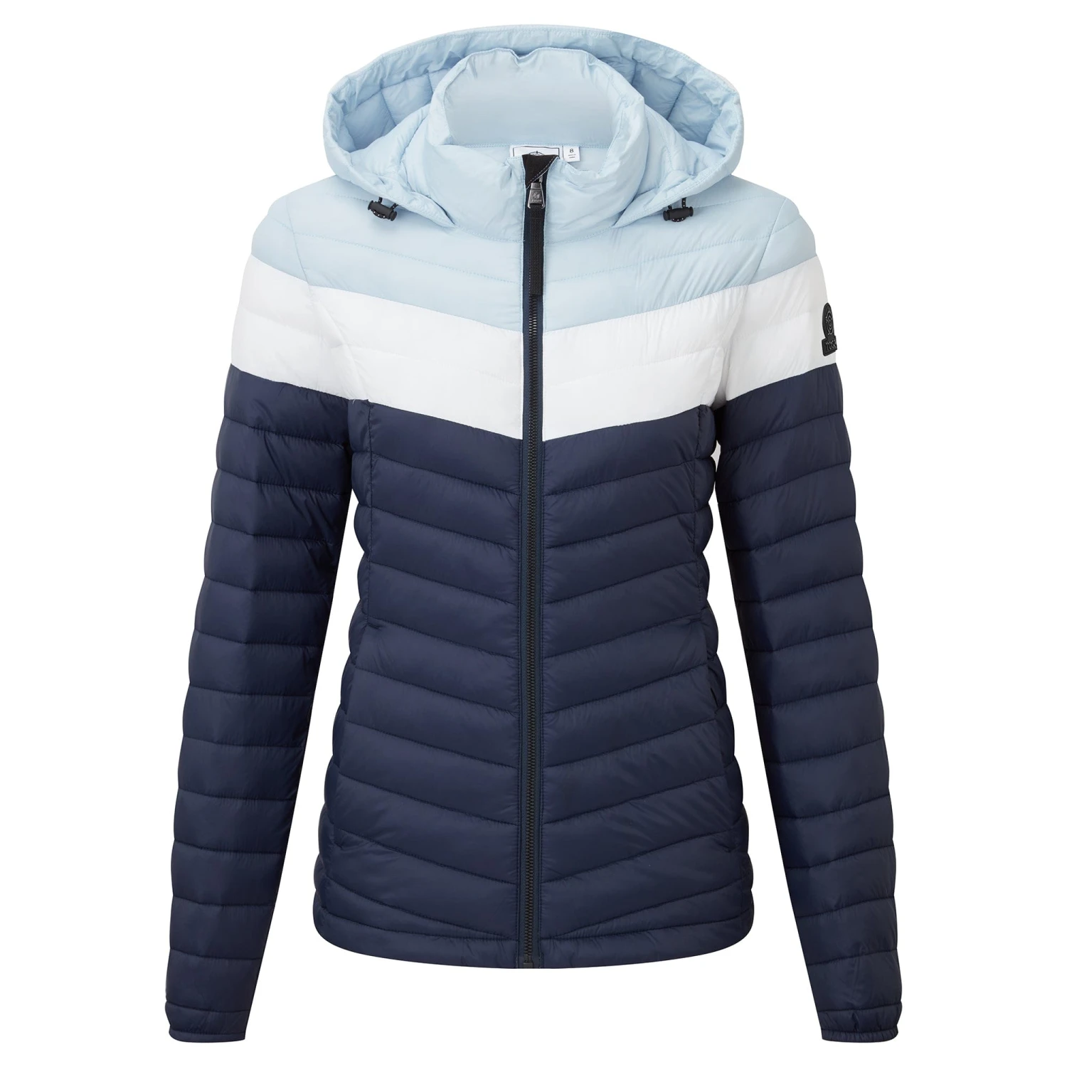 Lightweight, wind resistant and buttery soft, our Garriston quilted jacket gives you warmth without adding bulk and is designed in bold, chevron colour blocks inspired by moorland heather and the churning Atlantic sea. This distinctive and versatile jacket is perfect for travel as it squishes down small and springs back into shape when you need it. The thermal filling is made from recycled plastic bottles, so you’ll be doing your bit to protect the environment too. Garriston has a cosy inner collar for added comfort and a fixed, insulated hood with toggle adjusters. There are two handy zip up pockets and a full length, easy pull zip at the front. The finishing touch is our iconic embossed rubber Yorkshire Rose badge on the sleeve.
