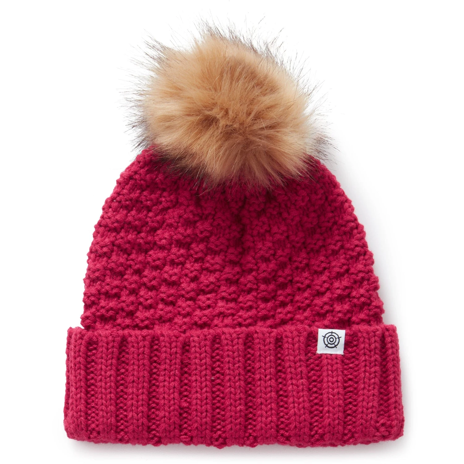 Knitted winter hat with box stitch knit pattern, faux fur pompom and folded label branding