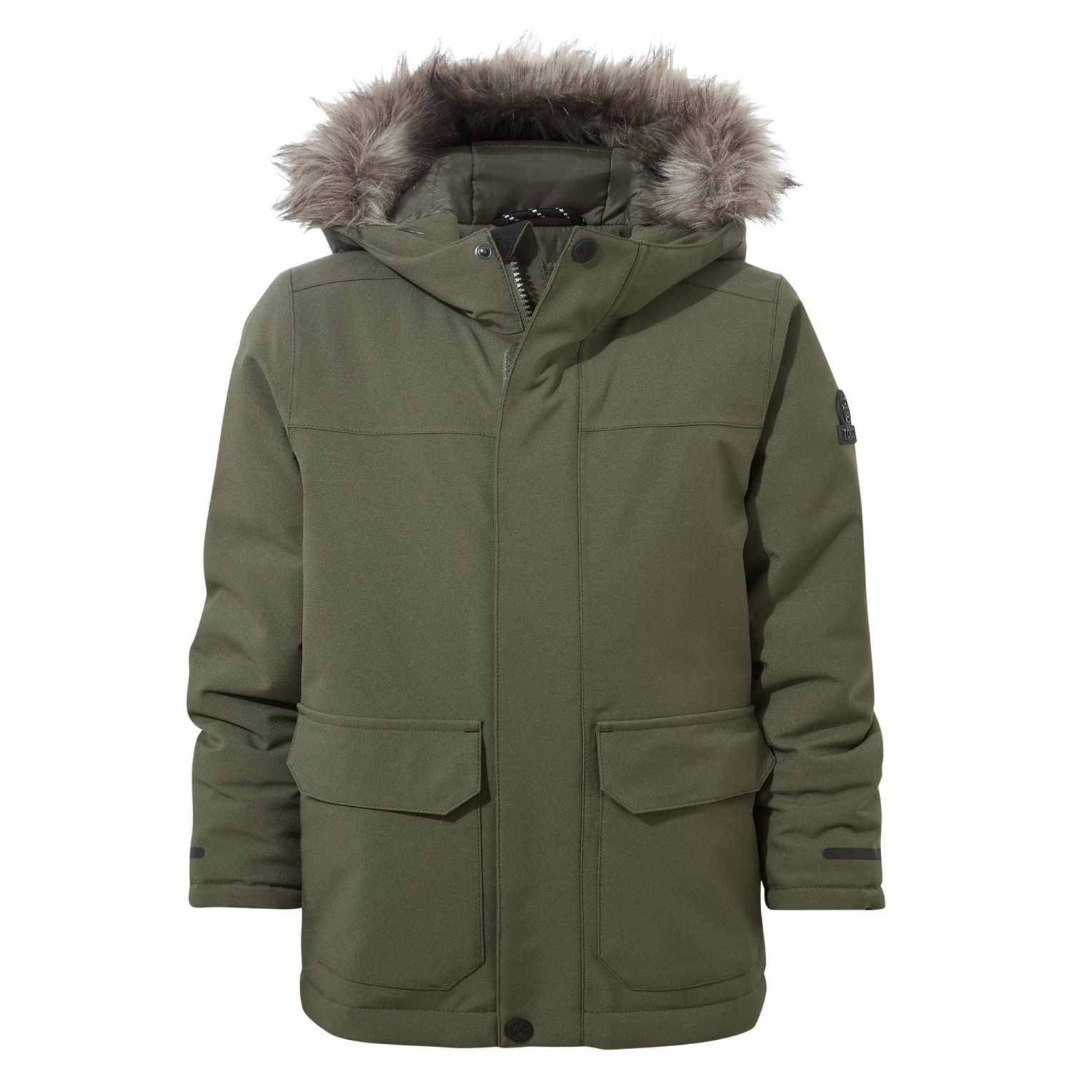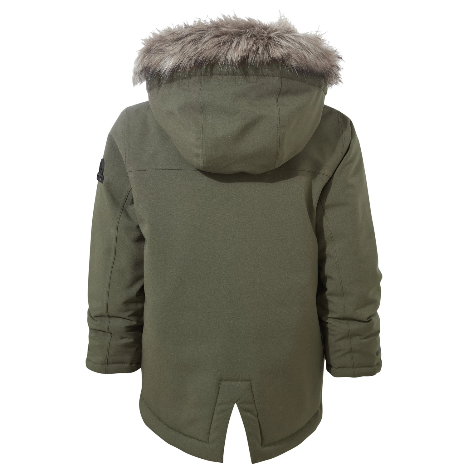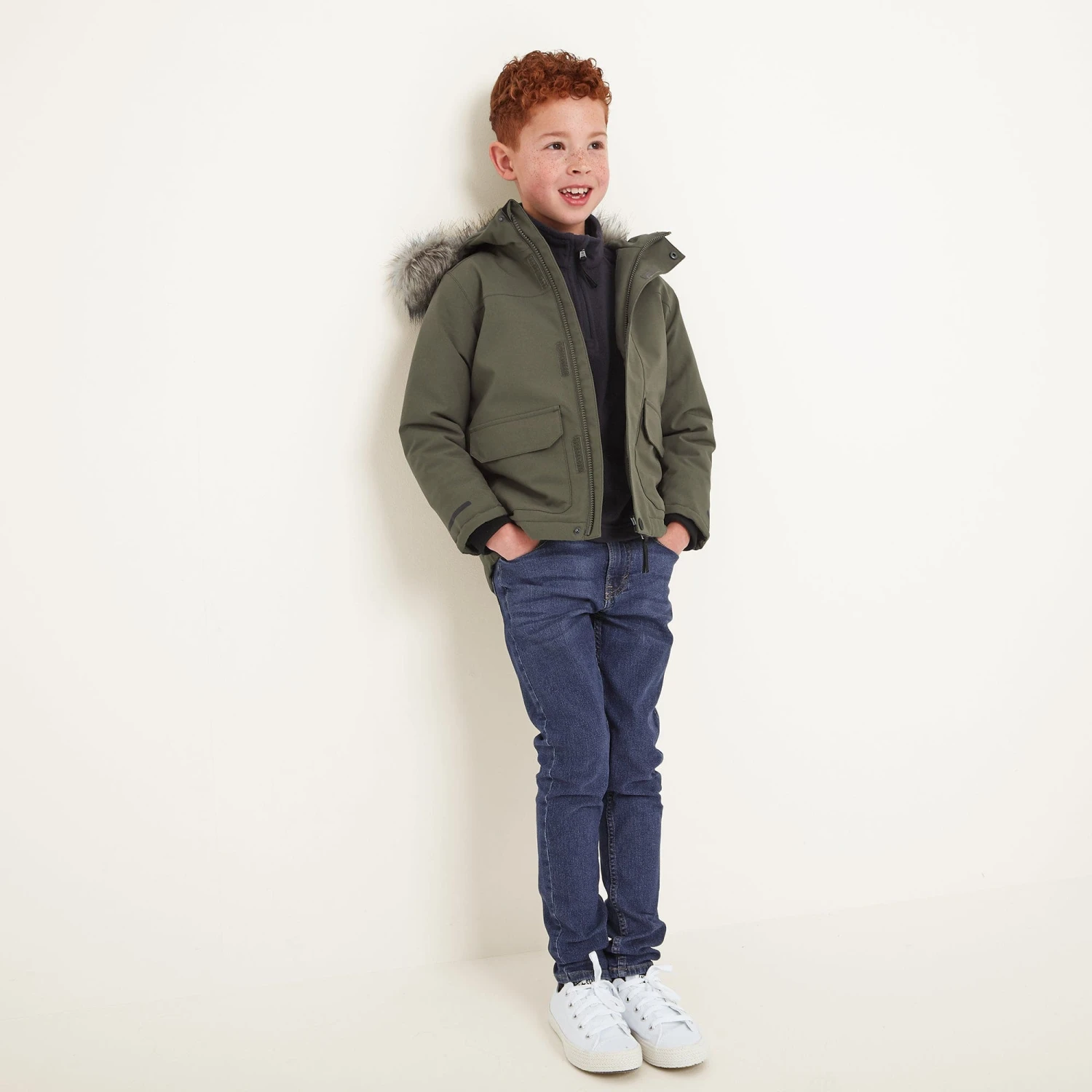 High tech features are combined with classic parka styling in our Peckett winter coat for kids that is waterproof, breathable and rainproof. Made from our signature cotton-feel fabric, this durable coat is finished with fully taped seams and an invisible water repellent coating for total protection from the elements. It’s super warm too thanks to a high-performance thermal filling made from recycled plastic bottles (PET polyester 100%) and has a soft quilted lining inside that makes it cosy to slip into. Designed by our team in West Yorkshire in colours inspired by the rugged landscape around us, Peckett has all the retro parka styling with a removable faux fur trim around the hood, patch pockets and a fishtail vent at the back. The full length covered zip is fastened with press studs and Velcro and there is a handy adjuster tab at the back of the hood. There are also neat reflective strips on the cuffs that stand out against car headlights at night for safety. Peckett is finished with